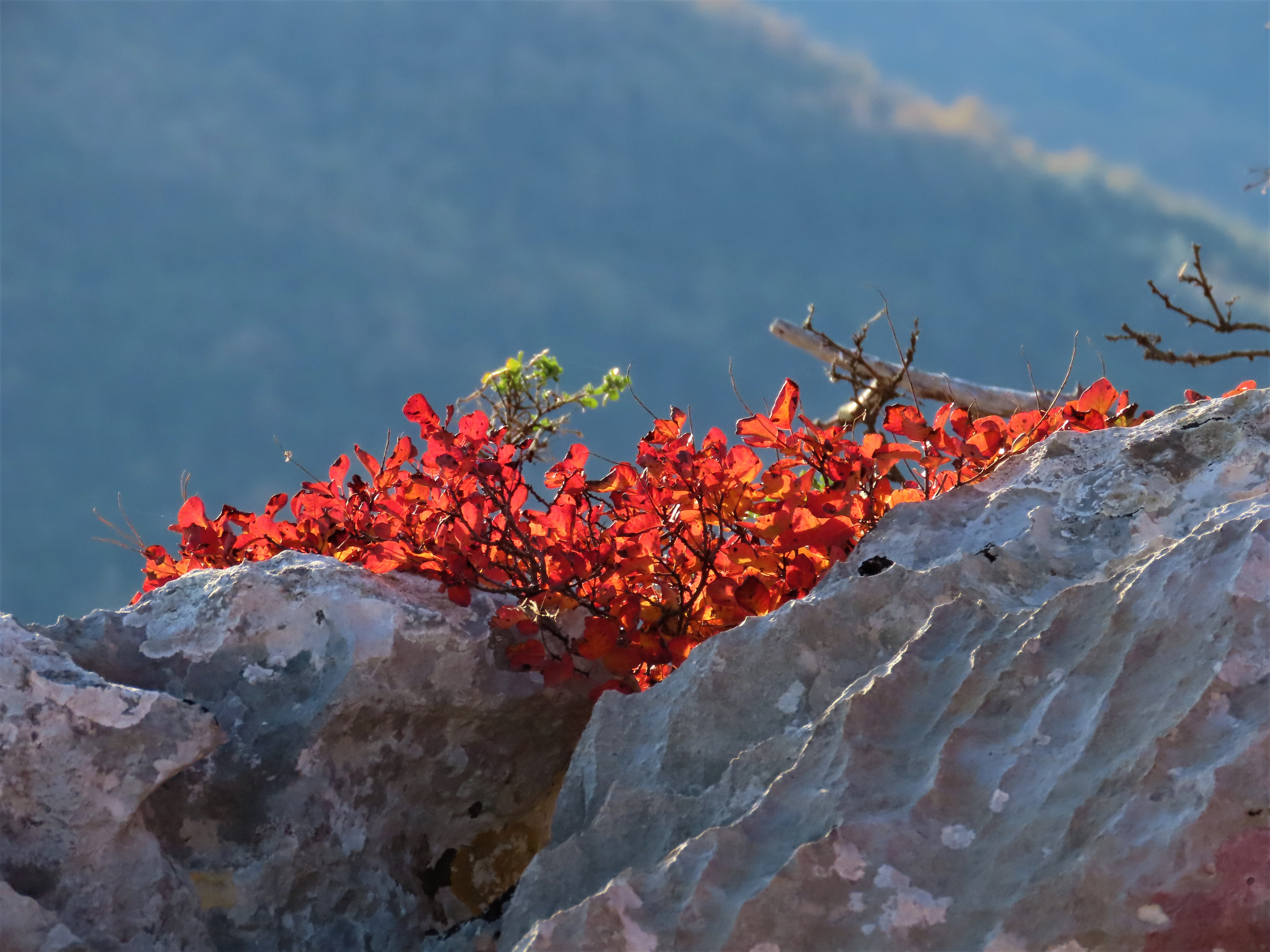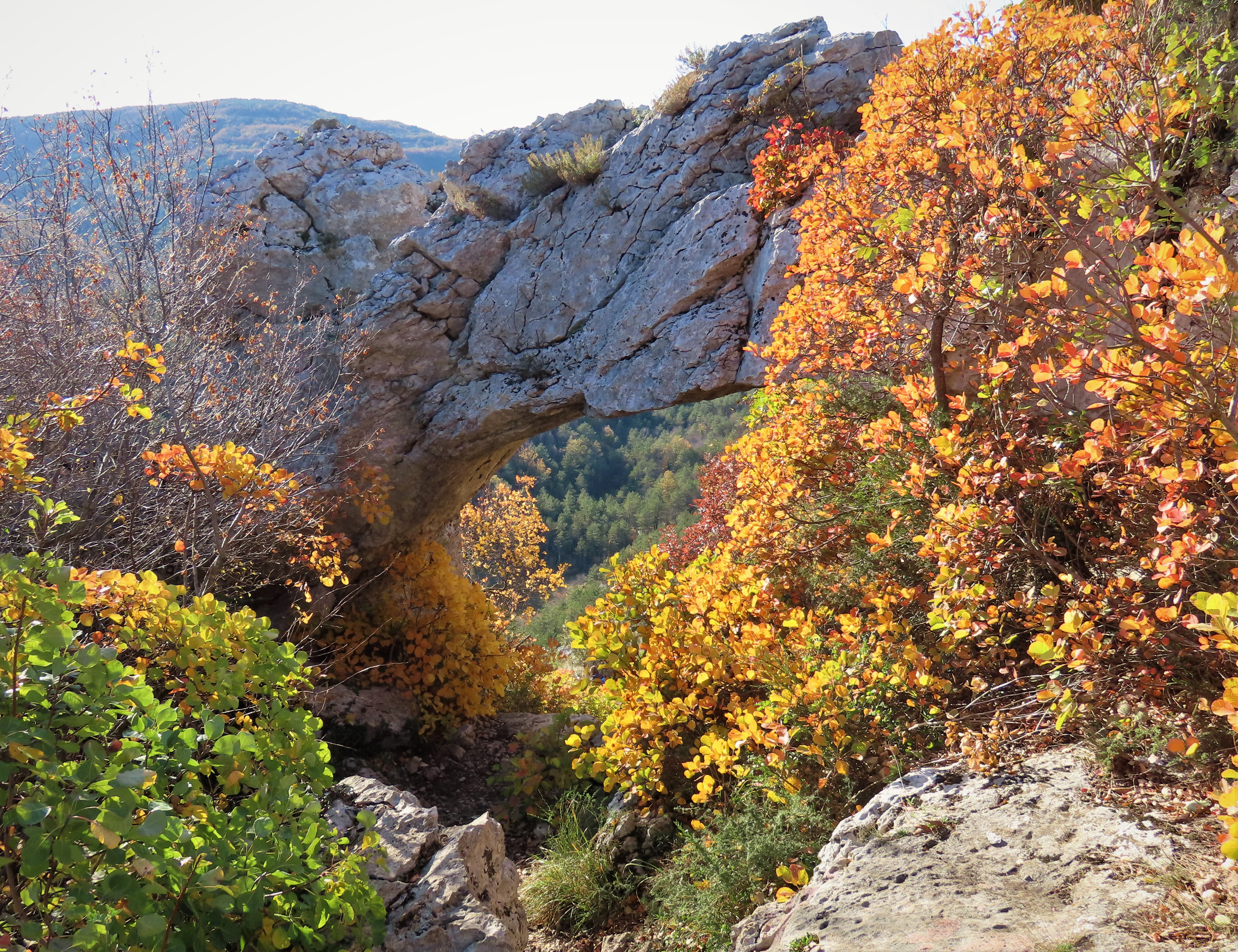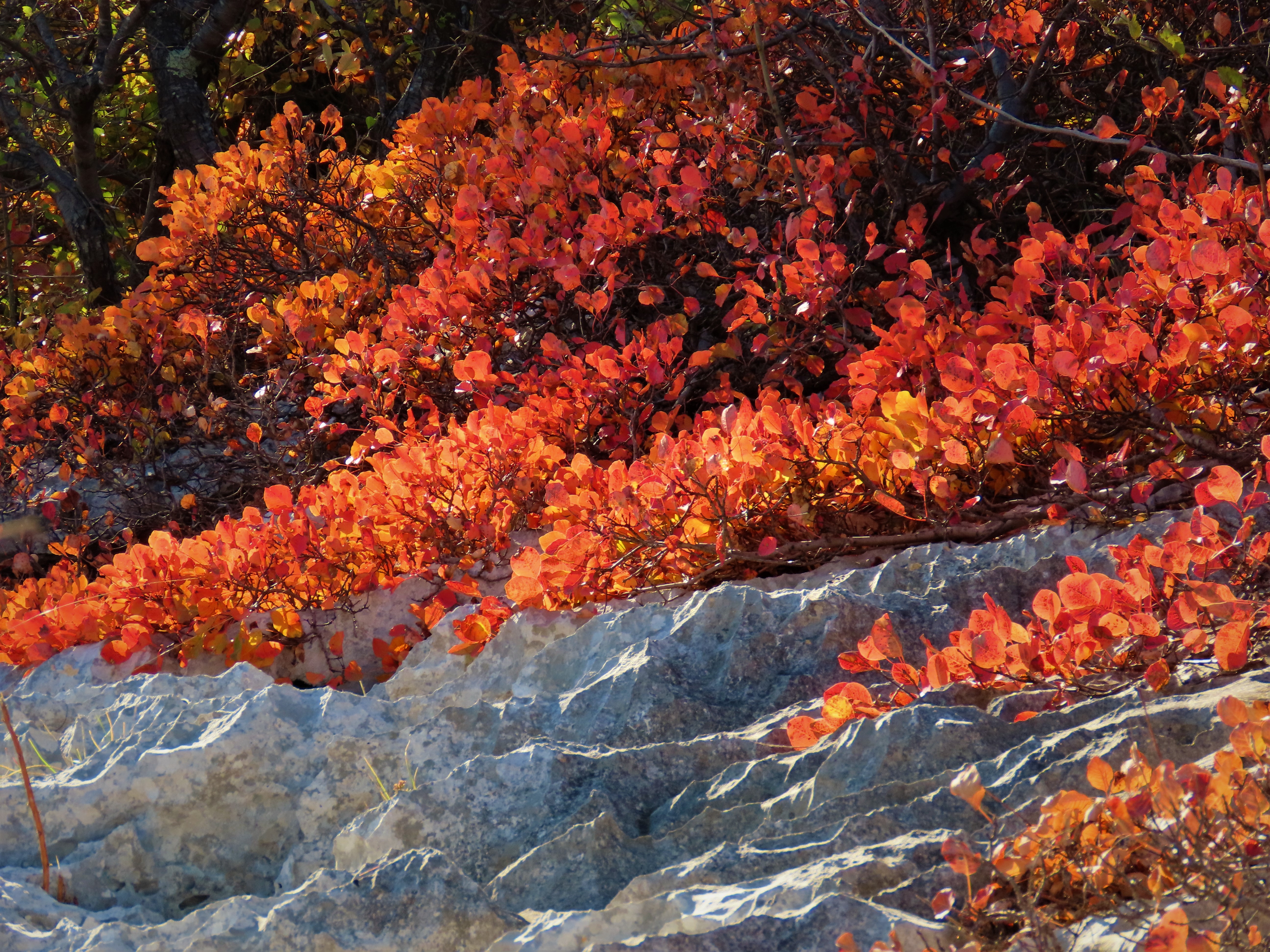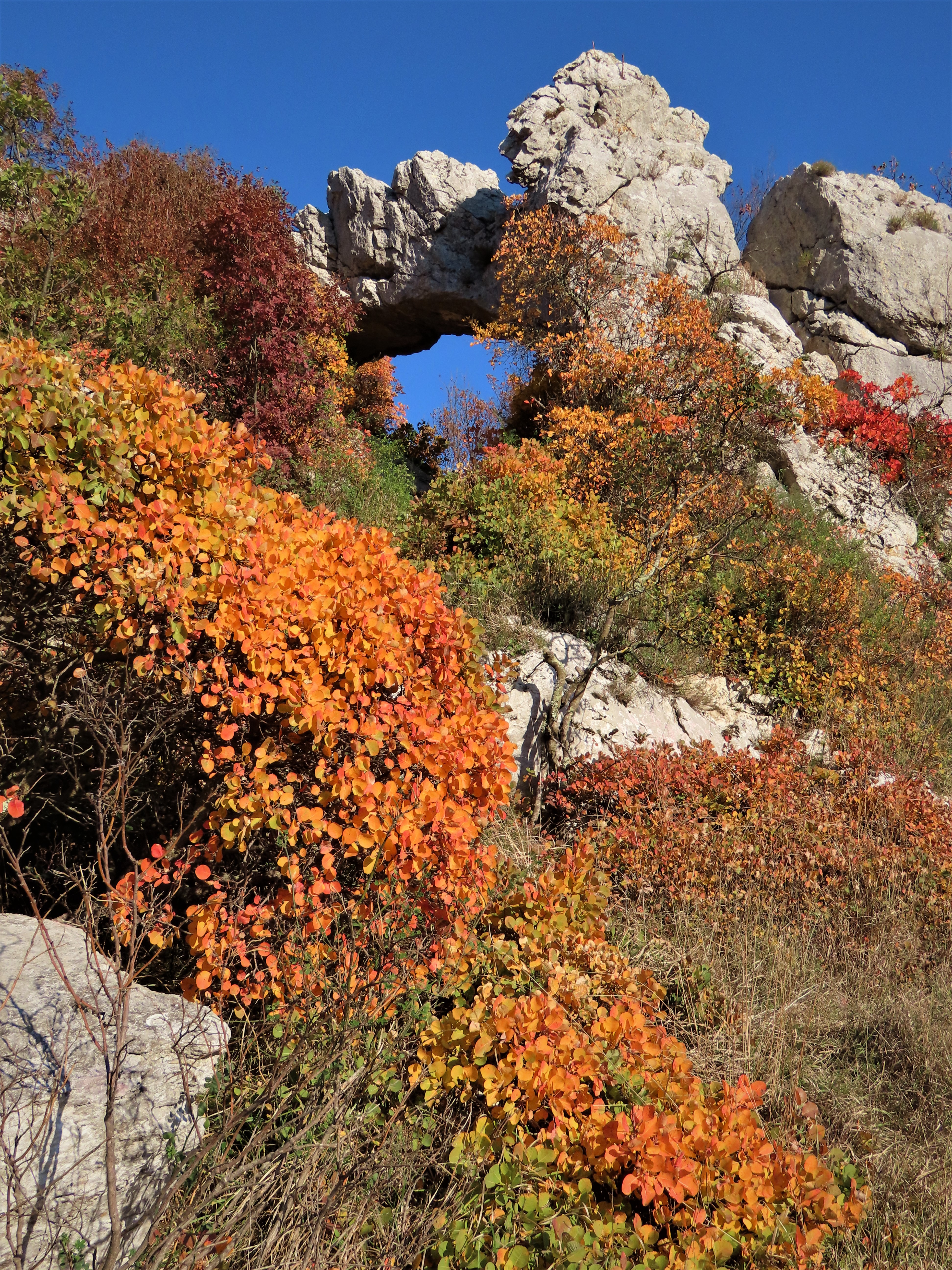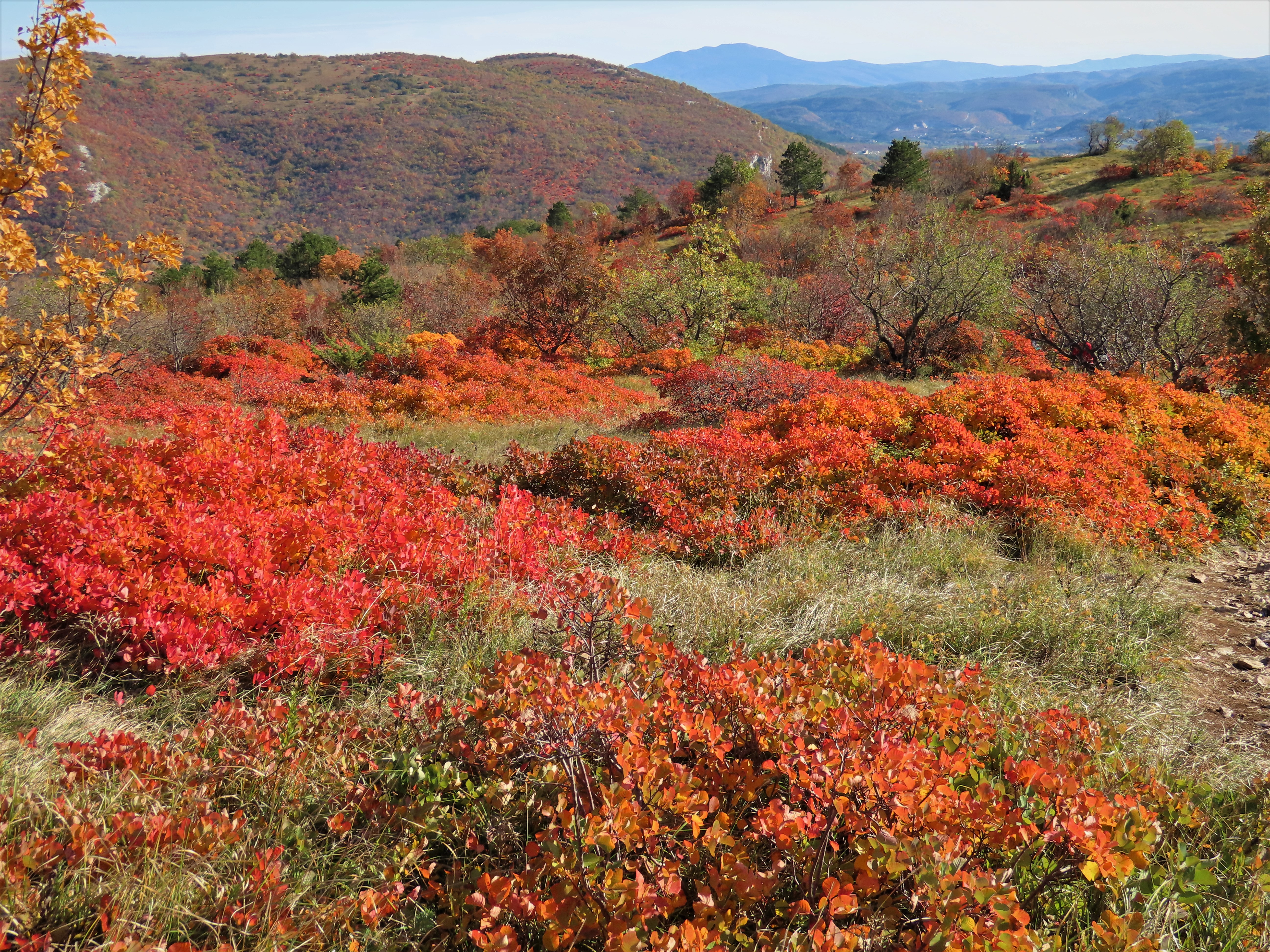 Čas pohoda pa bomo podaljšali zaradi barvitega grmičevja - ruja, ki se prav zdaj začenja odevati v jesenske barve. Ruj je čez leto zelene barve, jeseni pa se listi najprej obarvajo rumeno, nato v oranžno barvo, ki zatem prehaja v rdečo, najprej bolj živahno, svetlo, kasneje pa v bolj ognjeno in nato temnejšo, ki ji rečejo tudi barva volovske krvi, vendar, ker smo na Krasu, bi bolj ustrezalo poimenovanje po barvi kraškega terana. Barvite poljane ruja vsako leto privabljajo vse večje množice občudovalcev. Tokrat se jim bomo pridružili še mi. In prav zaradi občudovanja barvitih preprog in slikanja bo naša pot trajala nekoliko dlje, kot je potrebno zanjo. Za celotno pot bomo tako s postanki potrebovali 3 do 4 ure, v Trzin pa se bomo vrnili v popoldanskem času.