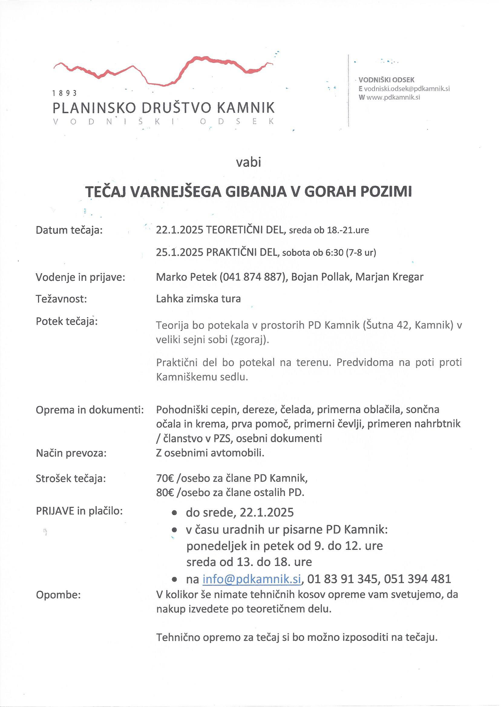 - teoretični del (PD Kamnik, Šutna 42) sreda, 22. 1. 2025, 18.00 - 21.00