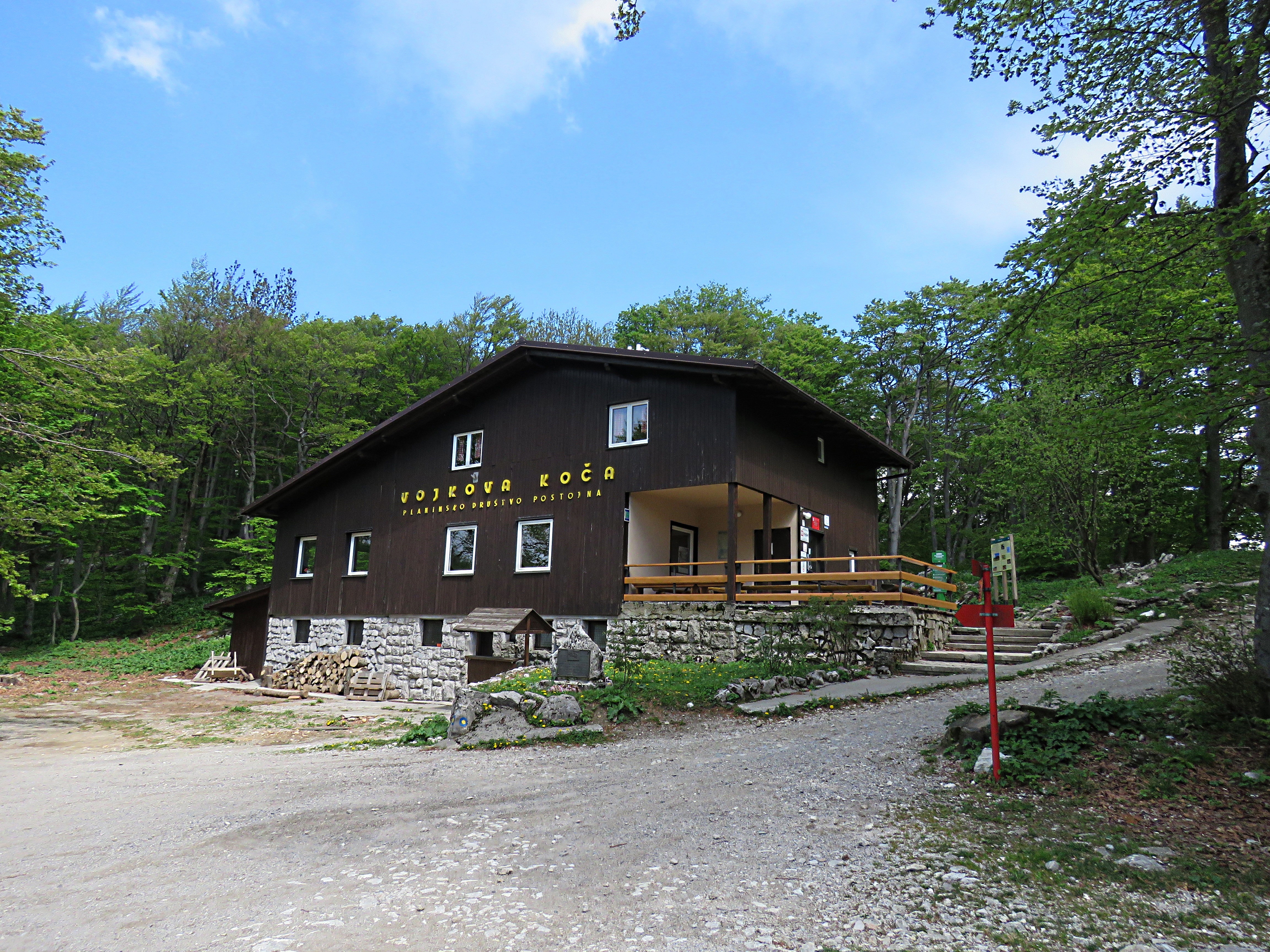 Opis poti: S parkirišča se najprej sprehodimo do lovske koče, nato pa nadaljujemo v smeri sv. Hieronima in Vojkove koče na Nanosu. Pot gre že po nekaj korakih v gozd, kjer se prične rahlo vzpenjati. Po krajšem vzponu nas pot pripelje na neizrazit vrh Strmec, s katerega sledi kratek spust. Le malo naprej nas pot pripelje iz gozda na travnata pobočja, ki so občasno porasla z grmičevjem in posameznimi bori. Lahkotna in komajda kaj vzpenjajoča pot, se nato za kratek čas priključi cesti, a jo že po nekaj korakih zapusti. Pot se nato cesti umakne nekoliko bolj v desno in se prične zmerno vzpenjati čez vse bolj razgledna pobočja Nanosa. Tu se nam z desne priključi nemarkirana pot, ki se je nekoliko nižje odcepila v desno. Pot naprej postane še malenkost bolj strma in nas po nekaj minutah nadaljnje hoje pripelje do že od daleč vidne cerkvice sv. Hieronima. Od cerkvice nadaljujemo rahlo desno po poti, kateri se le malo višje z desne priključi položna pot iz Razdrtega. Nadaljujemo v smeri Vojkove koče po poti, ki nas le nekaj korakov naprej pripelje na manj opazno razpotje, kjer se v levo odcepi nemarkirana pot na Grmado. Nadaljujemo rahlo desno po markirani poti, ki se naprej kar nekaj časa vzpenja vzporedno s cesto. Pot naprej se od ceste oddalji še malenkost bolj v desno in preide na razgleden severozahodni rob Nanosa. Tu se nam z desne skoraj neopazno priključi t.i. Janezova pot, mi pa nadaljujemo naravnost po široki stezici, ki nas vodi proti oddajnikom na Nanosu. Le malo pred oddajniki pot zavije v levo, se spusti v pas gozda in nas nato mimo spomenika Janka Premrla Vojka, pripelje do Vojkove koče na Nanosu.
