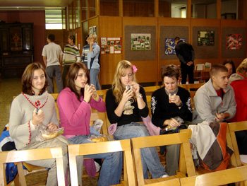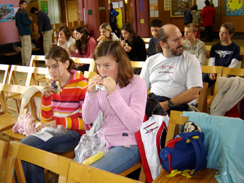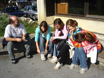 Sprejelo nas je precej lepo vreme in zelo prijazni gostitelji. Po uvodnem programu (ki je bil letos, pohvalno (!), neobremenjen s tremi himnami - zapeli in zaigrali so le slovensko - lani smo namreč poslušali slovensko, evropsko in planinsko – otroci pa potem niso več vedeli, kdaj je treba stati ...) so se ekipe razporedile po razredih, mentorji pa smo v zbornici v prijetnem pogovoru nanizali nekaj problemov, predvsem o načinih informiranja, seveda pa nismo pozabili tudi na probleme finančne narave.