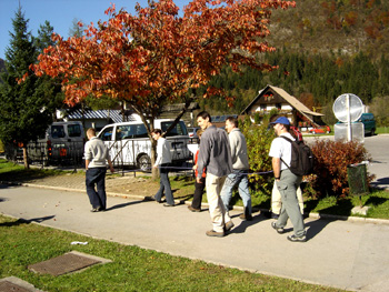 Ker organizatorji potrebujejo nekaj časa za popravljanje testov, so pripravili orientacijski pohod. Da mentorji ne bi »obsedeli«, je Irena predlagala, da se tudi sami pomerimo na progi. Beseda je dala besedo – takoj je nastala ekipa, Emil je potegnil iz nahrbtnika prusik (da smo se zanj držali kot v vrtcu – pač vse za smeh!) – in takole smo mentorji odkorakali izpred šole. |
