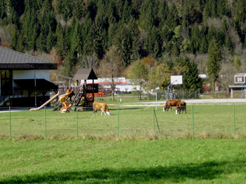 Ob vračanju k šoli smo bili priča za nas, ki smo doma v »ljubljanskem kotlu«, kaj nenavadnemu pogledu. Krave se mirno pasejo na igrišču. Kar predstavljali smo si, kako bi se pri nas »ultra razvajeni starši« pritoževali nad to idilo. Kot da večina Slovencev nima svojih korenin ravno na kmetih ... |