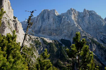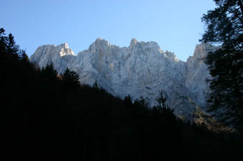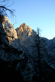 Škrlatica, Rakova špica in Rogljica v večernem soncu. |