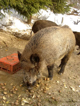 Pri bližnji okrepčevalnici si za ogrado lahko ogledamo divje svinje. |