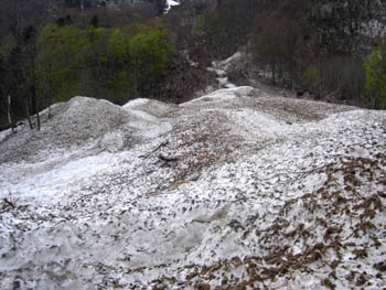čelo plazu – sneg se počasi topi, a še vedno se da zaznat mogočnost plazu.