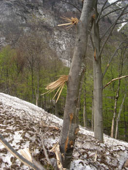 Plaz, ki je iz Mihove grape »ušel« na pobočja, desno od spodnje postaje tovorne žičnice na Kokrško sedlo je takole »odbil« veje drevesu. Škode v gozdovih je precej.