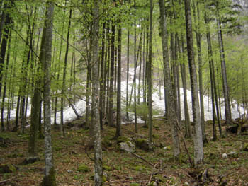 Ostanki plazu pod »Bobnarjem«. Grapa je sicer precej »suha«, a snega je v vznožju mnogo.