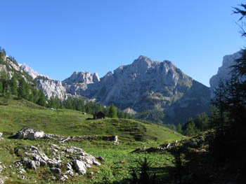 Sledovi nekdanjih stanov na Planini pod Mišelj vrhom, v ozadju kraljuje Vernar.