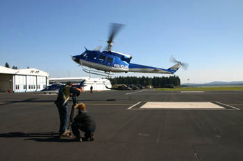 Pristanek helikopterja na letališču Brnik. Posnetki gora so varno spravljeni na traki – videli jih bomo še letos v oddaji Slovenski magazin. |