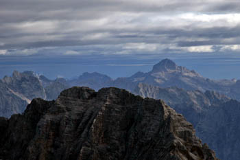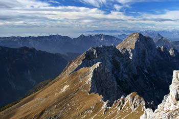Strma peč (Monte Cimone), 2379 m – tu se končajo Julijci. Desno od gore se grezi dolina Dunja. Daleč zadaj pa nas že pozdravljajo Dolomiti. |