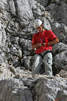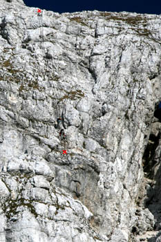 60 metrov visoka »Pipanova lestev«. V sivini skal se jo kar težko opazi (zato smo jo označili z rdečima križcema). |