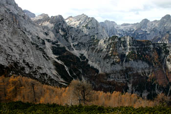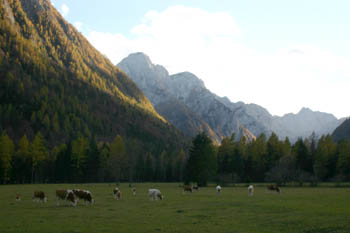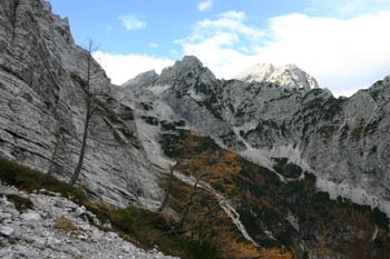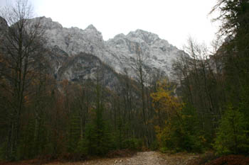 Začetek poti v dolini Kot – nad glavami pa velikani Luknja peč in Rjavina.