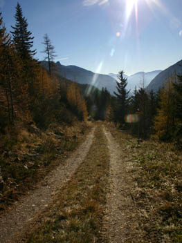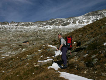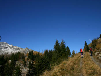 Vzpon skozi strm gozd jih je nagradil z jesenskimi barvami in občasnimi razgledi na Hochalmspitze in sosednje vrhove na drugi strani doline. Nad gozdno mejo so jih pozdravile že prve zaplate letošnjega snega, vendar jih ni kaj dosti motilo, saj so uživali v razgledu za bogove. Dan je bil res čudovito jasen in le izza daljnega Ankogla so se kazale meglice, ki so napovedovale spremembo vremena.