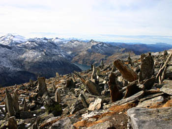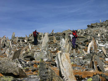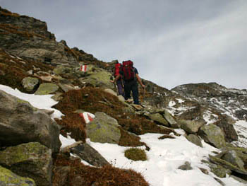 Pri vzponu na Großer Hafner nas čaka manjše presenečenje v obliki pokonci postavljenih granitnih blokov. (foto: Miro) |