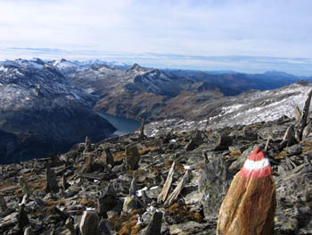 »Skalne igle« v daljavi pa ogromno akomulacijsko jezero, ki se nabira za jezom Kolnbrein. (foto: Tomaž) Povečava slike |