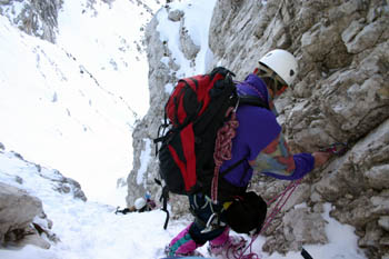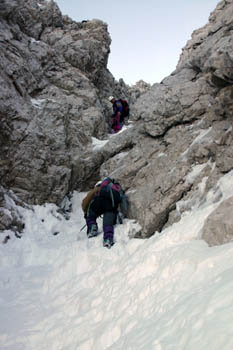 Sestop po Pripravniški grapi. Ob »dobrih zimah« so skalnati skoki lepo zaliti, letos pa … |
