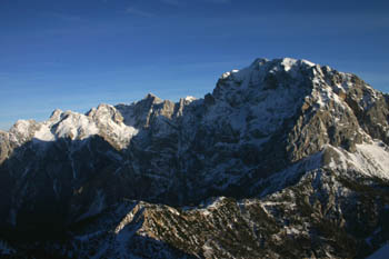 V ozadju Špik in Škrlatica s svojimi podaniki, spredaj pa Prisojnik – »Kiklop Julijskih Alp«, kot ga imenuje F. S. Copeland v svoji knjigi čudovite gore. |