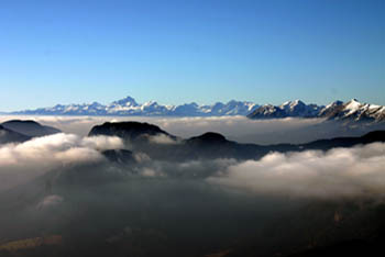 Širen razgled z vrha: V daljavi se kaže Triglav s svojimi podaniki, proti severozahodu pa pogled priklenejo Karavanke, predvsem greben Košute. |