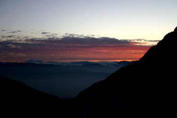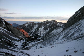 Spodaj z zadnjimi sončnimi žarki obsijana krnica Suho rušje, nad njo pa se dvigajo vrhovi Košute. |