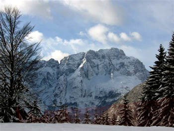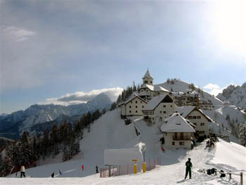 Višarje (Monte Lussari 1799 m), znana romarska gora, v ozadju kraljuje Mangart