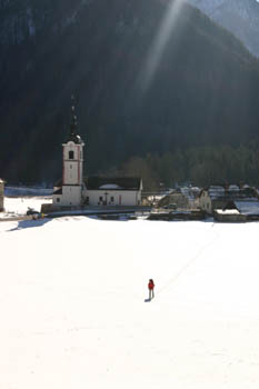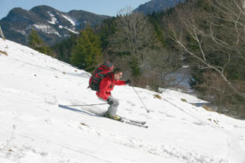 Kakšna zima … Smučar Davovega kova se mora »preganjat« po pravih »flikah« snega. |