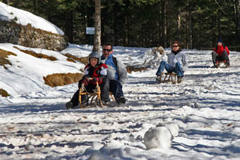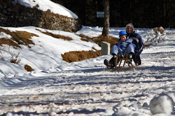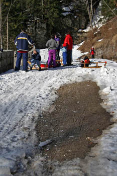 (Kako je bilo?) Vreme je bilo naravnost fantastično, vendar ko smo se peljali proti Ljubelju, ni bilo ne duha ne sluha o snegu. (Pa smo šli na sankanje, kajne?) Tudi na mejnem prehodu je bilo samo nekaj kupov snega. (Hmm, kaj bo s sankanjem?) Sicer je začetek poti bil kar obetaven in je zgledalo, da se bo možno sankat, vendar smo kmalu ugotovili, da so na več mestih luknje s kamenjem. (Takih zaviralnih mest si pa res nihče ne želi!!) Po približno pol poti pa je sledila odrešitev - ratrak, ki je je popravljal progo in zakrpal luknje. (Letos je bil ratrak odrešitev, lani pa ne – se jim je kakšen dan prezgodaj pokvaril!!!) Po dobri uri hoje smo prišli na stari Ljubelj in si v koči privoščili malico. (Prazen žakelj še nikoli ni stal – kako naj bi se pa peljal?) Po malici pa je sledil spust. (IIHHAAAA!!!) Proga je bila prav super - v zgornjem delu je bila dokaj trda, v spodnjem delu pa je bil sneg že zelo zmehčan. (Sankaško avanturo je kljub temu preživela 11-članska skupina neustrašnih: 4 otroci in 7 odraslih – kdo pravi, da je sankanje le za otroke ...?).