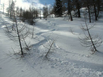Z Velikega Draškega vrha so se ravnokar spustili trije smučarji |