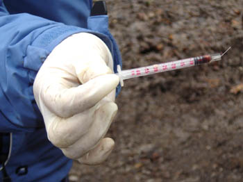 Še vedno najbolj zaskrbljujoče najdbe. Tu ni opravičil za tiste, ki so se pustili ujeti v svet omame – konkretno zavrženo iglo (na sliki) je ob gozdni cesti našel otrok!!! Kaj če bi …??? |