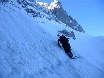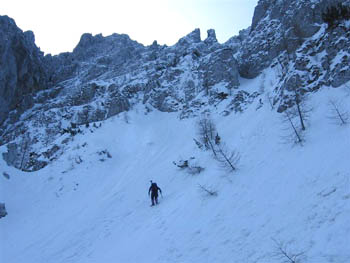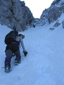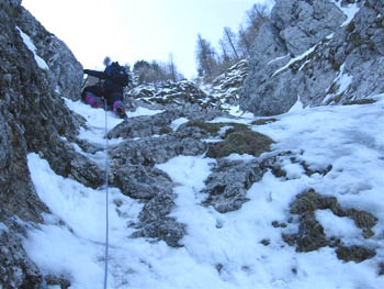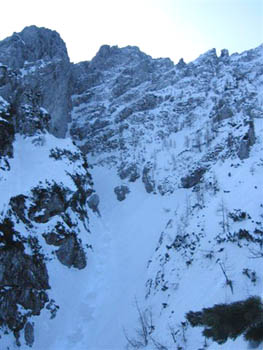 Do Doma pod Storžičem se da pripeljati brez posebnosti. Potem pa težke ruzake (vsaj jaz ) na hrbet pa smo šli lepemu dnevu naproti. Proti Kramarjevi smeri v Storžiču, kjer nas je za ogrevanje pričakal skorajda kopen skok. Potem dalje po trdem snegu, cepin in dereze so zares grabili kakor je bilo treba. Nad bivakom pa še nepredelan sneg, ena zoprna prečka, še en skok - tu je bilo treba še malo po ledu poplezat, skratka, adrenalina ni manjkalo. Na vrhu pa začuda samo en planinec (očitno so vsi jajca doma barvali)! Skratka, potem sem sam odsmučal izpod vrha v Peto žrelo (III+, S4-) v odličnih razmerah, vse do izstopa grape, kjer pa je bilo nekoliko poledenelo. Bogdana in Lado sta pripešačila za menoj, medtem pa sem se jaz nastavljal soncu …