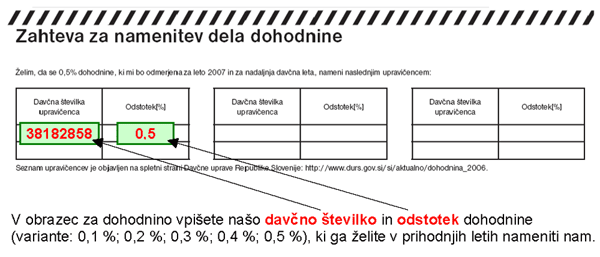 če se torej odločite za tovrstno donacijo in s tem podporo našim programom, vas prosimo, da na zadnji strani obrazca za odmero dohodnine, v rubriki "Zahteva za namenitev dela dohodnine" vpišete društveno davčno številko 38182858 in navedete želeni odstotek (največ do 0,5%). Vljudno prosimo, da o tej možnosti obvestite tudi vaše sorodnike, prijatelje, sodelavce, sosede in druge prijazne državljane.