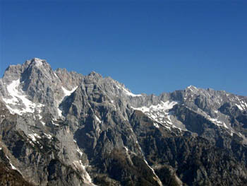 Triglav - po snežišču (v soncu) pod robom stene poteka znamenita Frelihova prečnica |