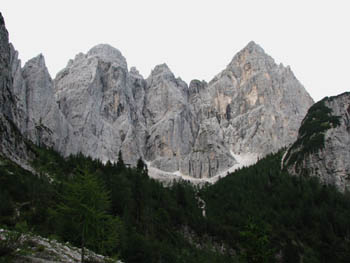Pogled na Viševo skupino od koče Pellerini (1499 m): spredaj Žabniška krnica, zadaj pa se vrstijo vrhovi – najbolj izrazita na levi Divja koza (Cima di Riofreddo, 2507 m), nato sledita Mala špica (Innominata, 2463 m) in Turn Gamsove matere (Torre, 2503 m). Vidimo še dokaj neizrazito Gamsovo mati (Madre dei Camosci, 2518 m), nato pa je na desni silna gmota Viša (Jôf Fuart, 2666 m). Primerjaj s sliko. |