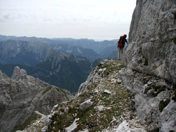 Sestopali smo po normalki proti Corsiju, nakar smo zavili levo na plezalno pot Anita Goitan. Hoja po zračnih policah, sledijo sestopi in spet vzponi na škrbine. Medtem se je že povsem zjasnilo, postalo je prav vroče, zato smo si privoščili daljši počitek. Kako je prijalo! Ko smo prišli do Trbiške škrbinice nas je čakalo neprijetno presenečenje! Bili smo prepričani, da je najhujše že za nami, a temu ni bilo tako. Sestop po izredno krušljivi grapi z nekaj potrganimi jeklenicami … Ko smo sestopili čez težji, nezavarovan skok, smo si malo oddahnili. Pa ne za dolgo! Dolina je bila še daleč spodaj, potrebno je bilo sestopiti še po ok. 20 m visoki, rahlo previsni lestvi. To pa je bilo doživetje!