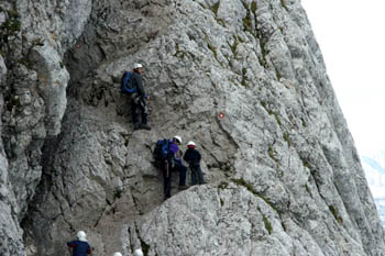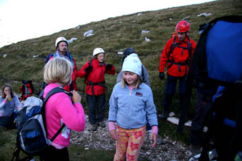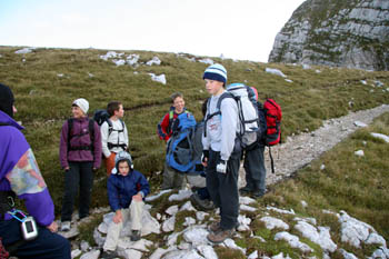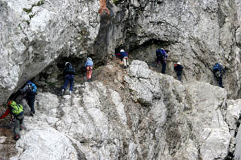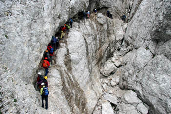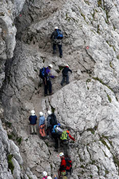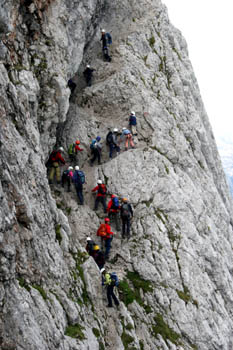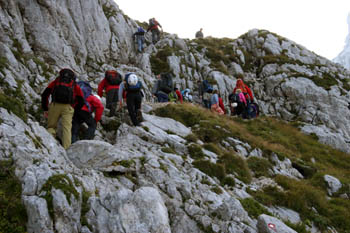 Pa je za nami zopet en "množičen" izlet. Bilo nas je kar 19. Po precej dolgi vožnji smo prišli na Mangartsko sedlo ter si nadeli plezalne pasove in čelade - bilo kar mrzlo in moram preči, da me je po vseh pripravah kar dobro zeblo. No, do vstopa v Slovensko smer smo se lepo ogreli. Slovenska smer je kar lepo speljana, jeklenica je dobro napeta, edino po tleh je ogromno grušča, ki smo ga seveda lepo "pucali" (beri: kamenje je letelo vse povsod). Na vrhu se z dobrim razgledom nismo mogli ravno pohvaliti, vendar pa smo vseeno "v delih" videli cele Julijce.