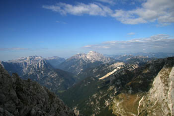 Pogled proti Zahodnim Julijcem. Dobro vidna 'rana' pa je plaz Stovžje pod Mangartom. |
