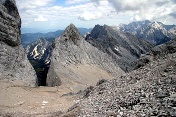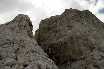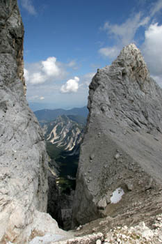 Na poti proti Jalovški škrbini. Nad nami Goličica, desno pa mogočna severovzhodna stena Jalovca, ki se dviguje nad Jalovčevim ozebnikom. |
