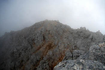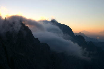 Pri sestopu preko Kriške stene družbo še vedno delajo oblaki in megla. V ozadju Prisojnik. (foto: Miro) |