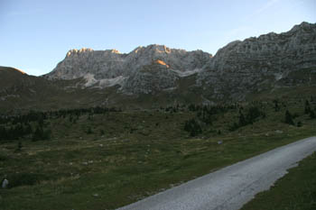 V jutranjem hladu proti koči Brazza (1660 m). Nad nami pobočje Špika Hude police (2420 m) po katerem vodi čudovita pot na vrh. |