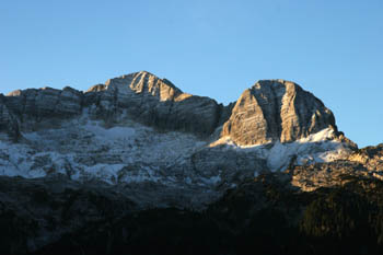 Najvišji vrh Zahodnih Julijskih Alp Špik nad Policami, furlansko Jôf di Montasio (Montaž) - prvi sončni žarki se dotikajo vrha (2753 m). |