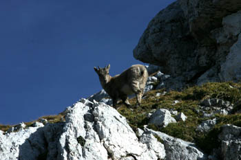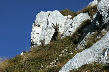 Po lepi, ne preveč strmi poti smo nadaljevali pot proti vrhu. Vmes smo poslušali žvižganje svizcev, nekje na sredini poti pa so našo pot prečkali kozorogi. Pa ne samo eden, po celem pobočju jih je bilo zelo veliko - pa še na pol udomačeni so bili, saj si jih lahko skoraj pobožal. Tik pod vrhom smo naleteli še na par flik snega in po slabih 3 urah hoje smo osvojili vrh. Razgled je bi fenomenalen, jesensko sonce nas je v brezveterju lepo grelo. Na obisk pa so seveda prišle tudi kavke. Ker se je na vrhu kmalu naredila velika gneča - skoraj taka kot v novem Mercatorjevem hipermarketu (HAHA) - smo se odpravili nazaj na planino Pecol.