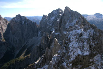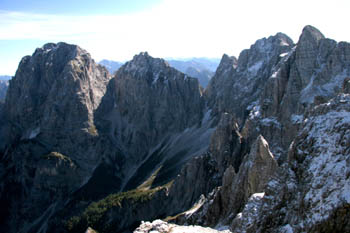 Viš (Jôf Fuart, 2666 m), Gamsova mati (Cima Alta delle Madri dei Camosci, 2518 m), desno Špik nad Špranjo (Modeon del Buinz, 2554 m) in Špik nad Nosom (Foronon del Buinz, 2515 m).