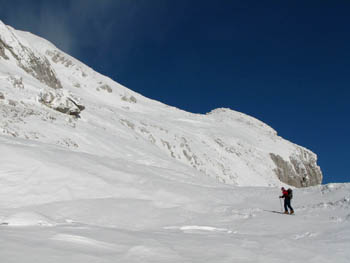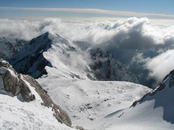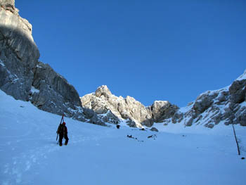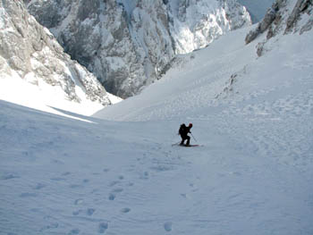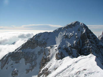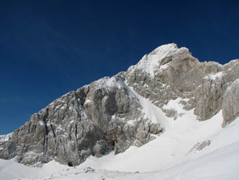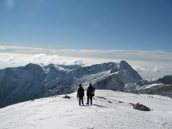 Lepo vreme nas je ponovno zvabilo v gore. Tokrat smo se odpravili čez Žmavcarje na Križ (2433 m) – goro, ki jo verjetno bolj poznate z imenom Koroška Rinka. Dva pešaka (Bogdana, Lado) in dva smučarja (Gorjan, Tomaž). Prava snežna odeja se prične tik nad gozdno mejo. Do vrha Križa je šlo brez težav, pešaka sta bila celo nekoliko hitrejša. Turni smučarji pač nekoliko bolj trpimo, ker nosimo na hrbtu precej več krame. Je pa zato potem spust toliko bolj uživaški! Bogdana in Lado sta se povzpela še na sosednjo, višjo Kranjsko Rinko (2453 m). razmere so bile naravnost fantastične, spust po še deviških pobočjih pa je bil ena sama poezija …