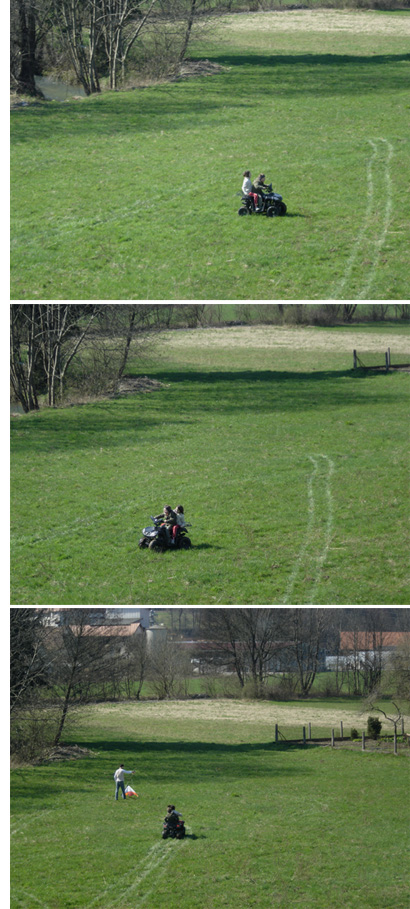 Tako smo 30. 3. lahko bili v Trzinu priča hrupnemu štirikolesniku, na katerem sta bila dva otroka. Brez trohice slabe vesti sta zapeljala na travnik (privatno zemljišče, seveda) in se predajala svojim užitkom.