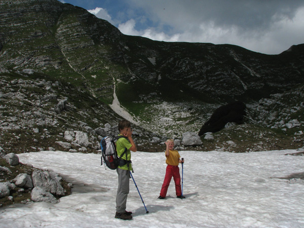 Ker je v soboto izlet na čisti vrh odpadel (tistim, ki se niste prijavili, vam je lahko še vedno žal ...!) je vodnik Miha s svojima sinovoma 'eno nadstropje višje' v neposredno soseščino, v eno najbolj samotnih, a izjemno prijaznih dolin - Travniško (tudi Travnikovo), kjer tačas še vedno vztraja nekaj snežišč! Miha poroča: Iz zaselka Na Skali (Soča) smo se po nekdanji pastirski stezi povzpeli na Sedlo (1.30h), od tam pa smo splezali po strmih travah na (Plaski) Kuk (1.30h), prečili greben Travniška planja - Travniški rob - Travniška škrbina vse do Travnika (1.45 h) in se vrnili prek Škrbine in Travniške doline na pl. Za skalo (1.30h) ter od tam sestopili nazaj Na Skalo (1.15h). Tokrat so bile v glavnih vlogah rože, svizci in gamsi ter mir!!! Baza oblakov, ki so se naredili čez dan je bila ravno malo nad nami tako, da smo od Kuka dalje hodili v senci, a s sončnimi razgledi.