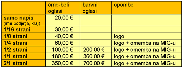 Cenik in velikost oglasov (bilten MIG) 20.12.2009