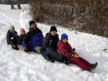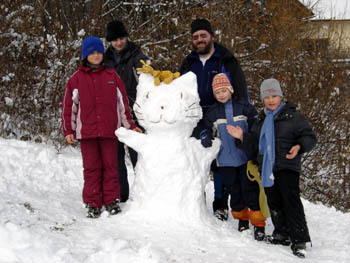 Udeleženci izleta - za fotoaparatom pa Irena, ki je bila glavna pobudnica ideje, da je tam nad vrtačo nastal snežen Garfield |