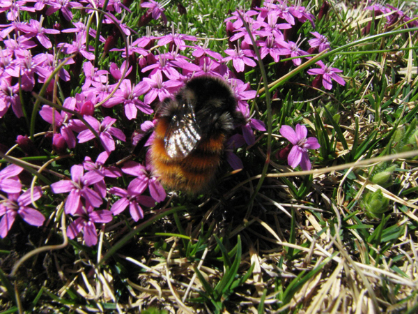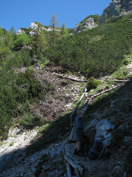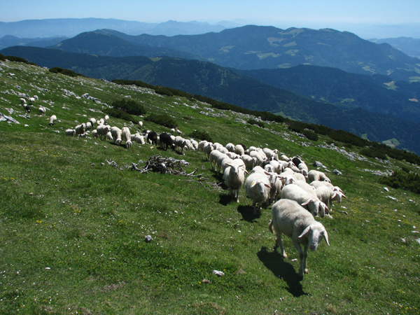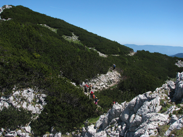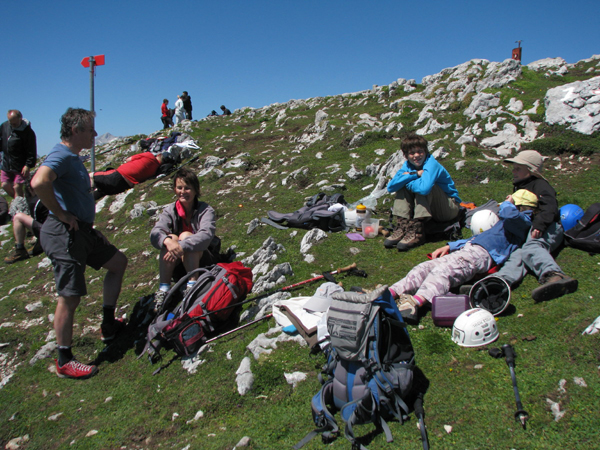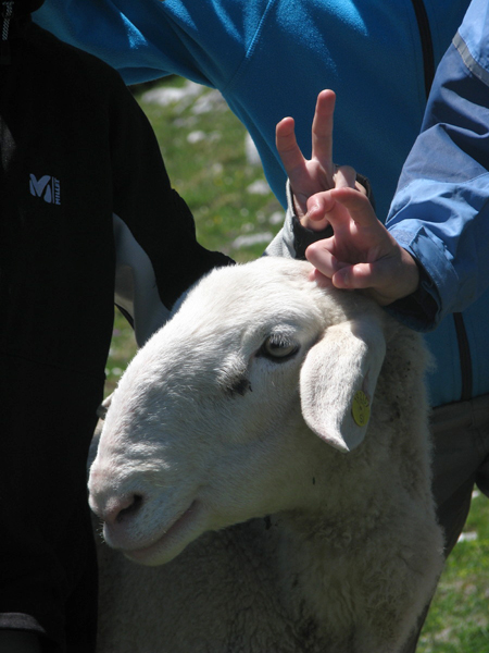 Mi pa po plezalni na vrh Raduhe. Bili smo ravno še dovolj zgodnji, da smo ubežali vse bolj močnim sončnim žarkom. Najtežja pot, ki pripelje na Raduho je speljana po naravnih prehodih, le zadnje četrt ure moramo malo bolj navpik ob jeklenicah in mestoma precej podrtem skalovju. Pot izstopi na vršno "ploščad" tik pod vrhom, kjer sta nas malo po 11.uri oz. po poltretji uri hoda pričakala dva tropa - trop planincev in ovčji.