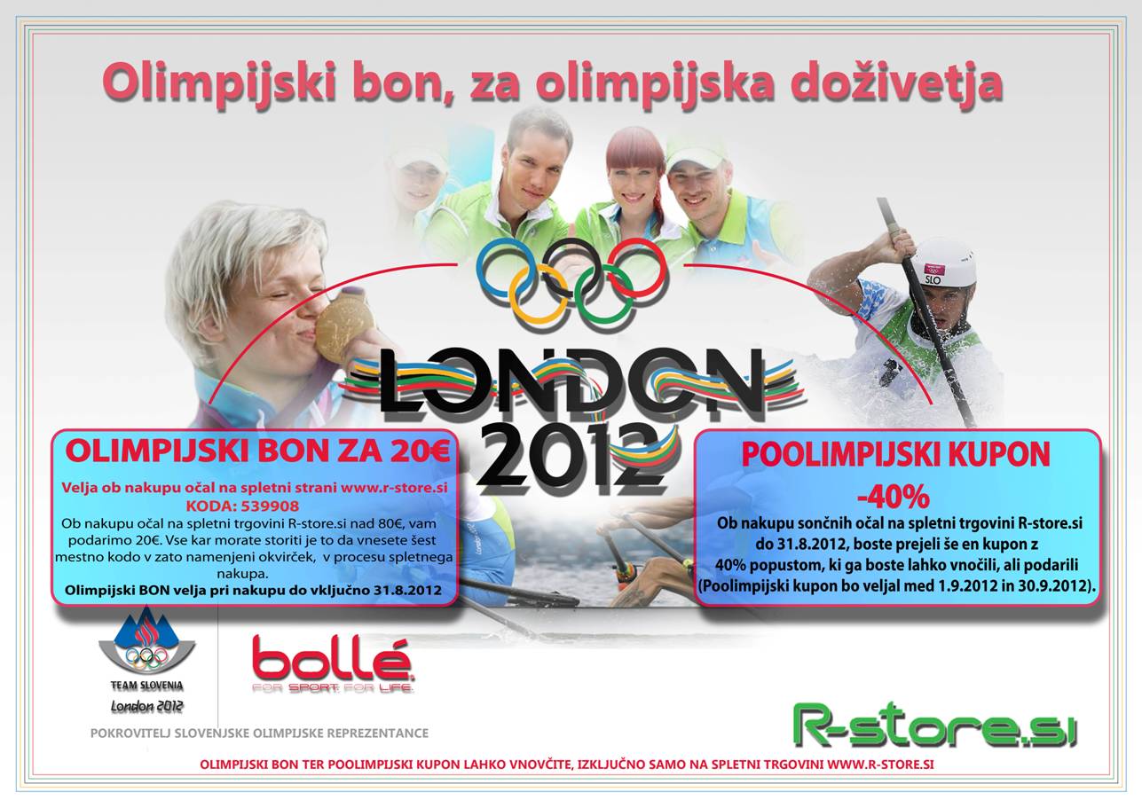 Ob nakupu prejmete Poolimpijski kupon z 40% popustom za nakup očal na spletni strani R-store.si, ki ga boste lahko unovčili med 1.9.2012 in 30.9.2012. Pohitite, saj Olimpijski bon za 20 € lahko unovčite samo do konca meseca avgusta.