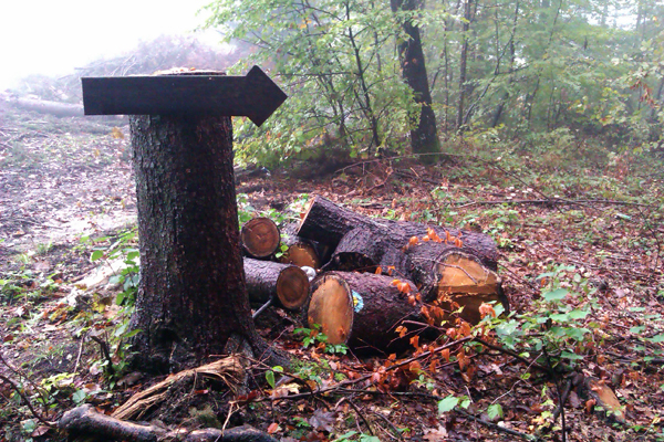 Sredi poti smo srečali posekan gozd. Tudi markacijam ni bilo prizanešeno (glej spodaj na hlodu).