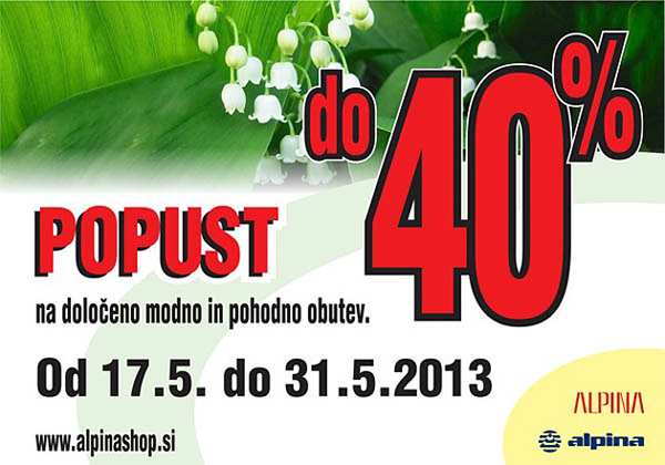 V času med 17. in 31. 5. 2013 nudimo DO 40 % POPUST na določeno žensko, moško in otroško modno obutev ter na določeno pohodno obutev Alpina. Akcija velja v vseh rednih prodajalnah Alpina.